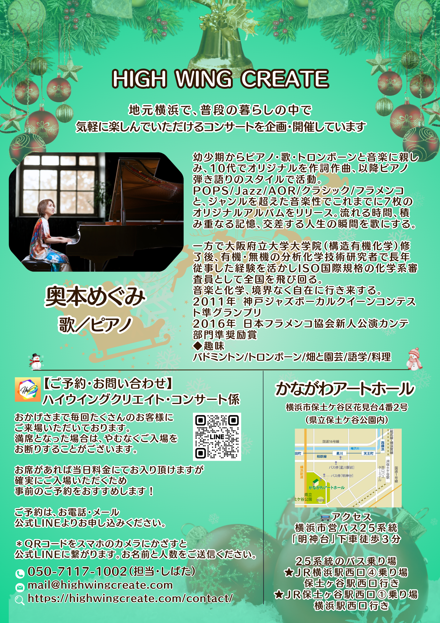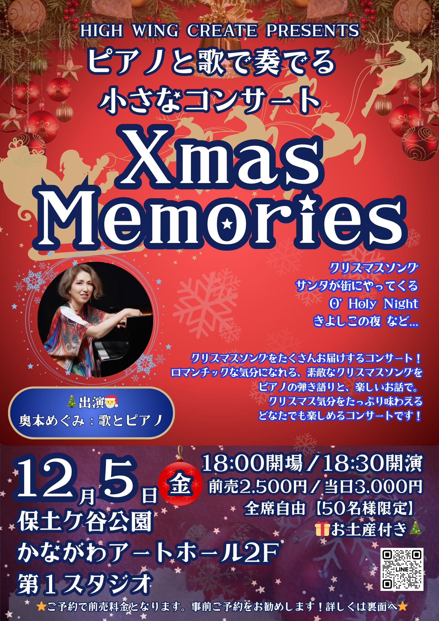 12/5 (金) | 横浜 ピアノと歌で奏でる小さなコンサート 〜Xmas Memories〜 クリスマス・スタジオコンサート かながわアートホール・第1スタジオ 18:00開場/18:30開演 一般-前売2,500円/当日3,000円 *お土産付き* 全席自由、ご来場順にご着席 【50名様限定!】 🎹出演🎙️ 奥本めぐみ-Vocal/Piano ![]() | ![]() ![]() おなじみアートホールで今年はクリスマススタジオコンサートを開催します! 聞くだけでロマンチックな気分になれる 素敵なクリスマスソングの数々。。🎄 ピアノの弾き語りと、お話と。 クリスマス気分をたっぷりと味わえる どなたでも楽しめるコンサートです! <演奏予定曲> クリスマスソング ジングルベル サンタが街にやってくる O’ Holy Night Silent Night-きよしこの夜 など |